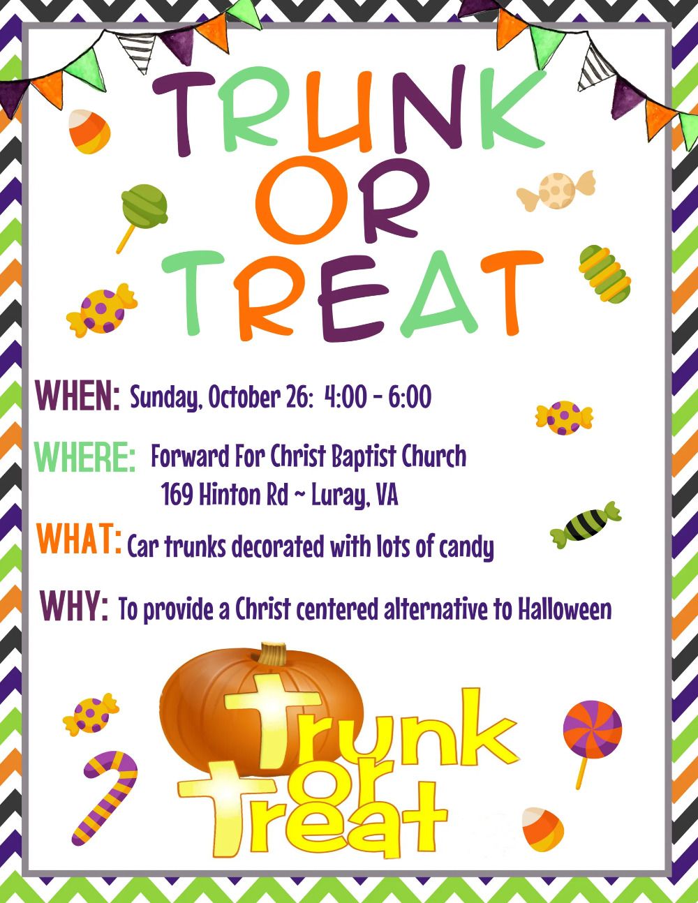 Our church members will have the trunks of their cars embellished with festive decorations and stocked with candy! Bring your kids for a fun time!